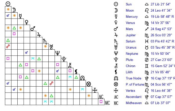 | Mercury | 19 Libra 58 | 21 Scorpio 1 | 16 Aquarius 36 |