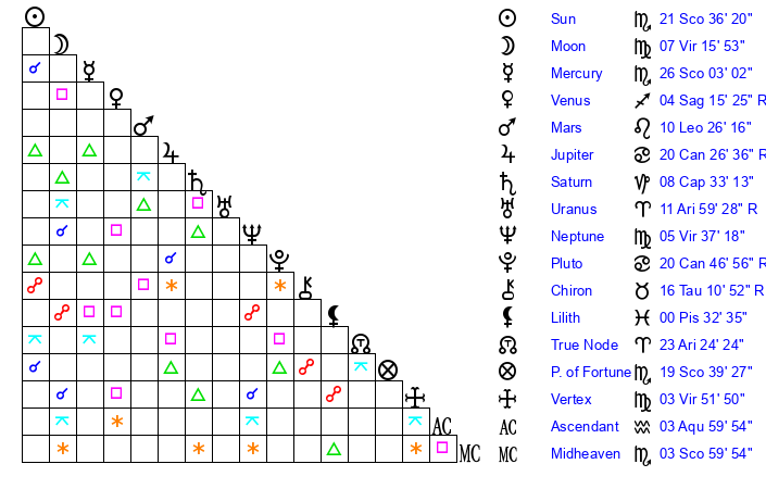 | Sun | 21 Scorpio 36 | 22 Scorpio 34 | 28 Aquarius 5 |
