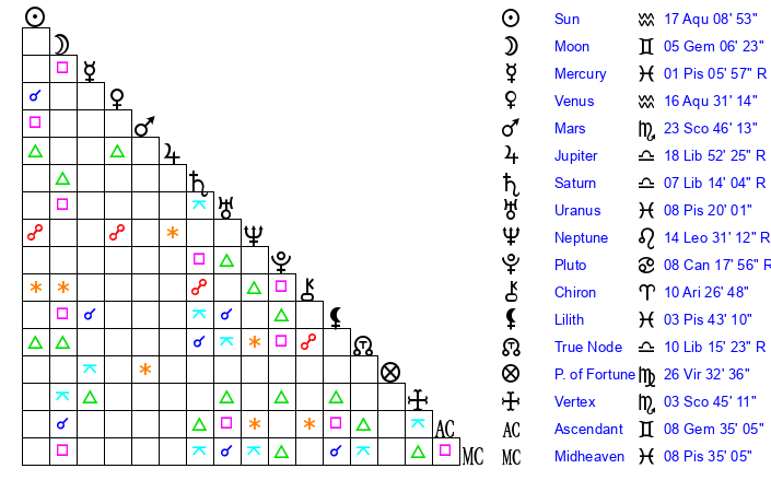 | Moon | 5 Gemini 6 | 6 Gemini 0 | 19 Pisces 57 |