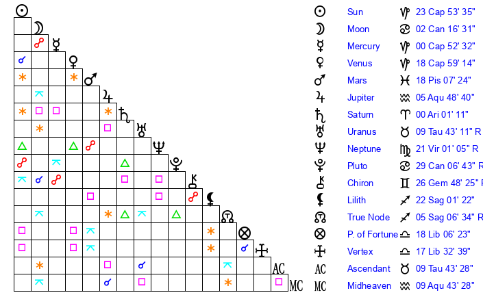 | Venus | 18 Capricorn 59 | 11 Pisces 52 | 7 Taurus 34 |