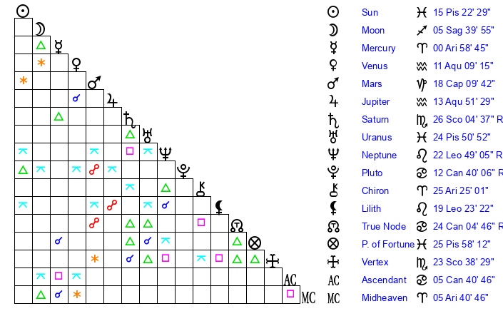 | Sun | 15 Pisces 23 | 16 Pisces 22 | 21 Gemini 54 |
