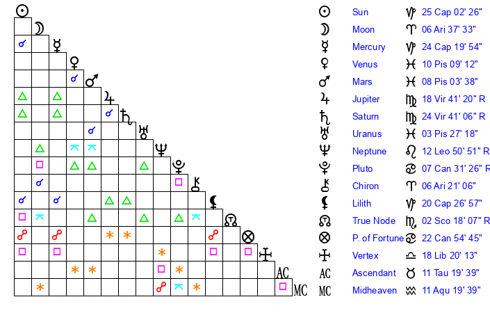 | Mercury | 24 Capricorn 20 | 10 Capricorn 38 | 26 Aries 53 |