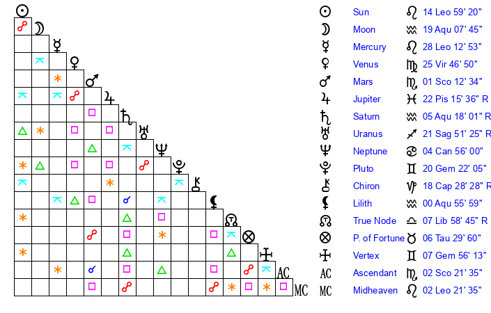 | Moon | 19 Aquarius 12 | 9 Aquarius 15 | 9 Leo 28 |