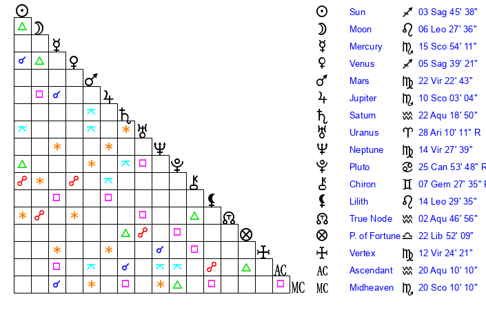 | Neptune | 14 Virgo 27 | 29 Pisces 25 | 13 Virgo 23 |