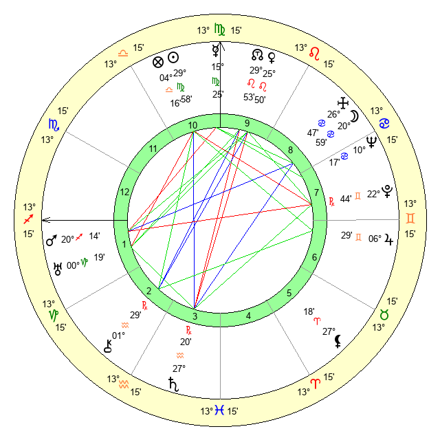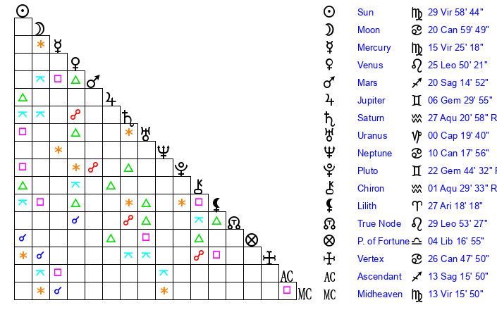 | Sun | 29 Virgo 59 | 0 Libra 55 | 0 Aquarius 47 |