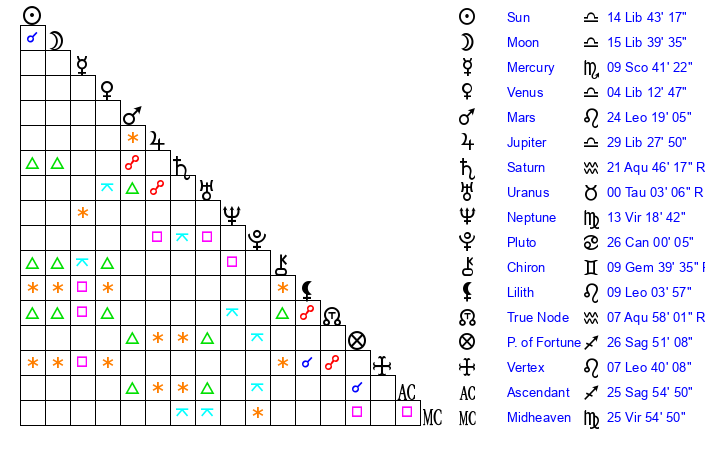 | Neptune | 13 Virgo 18 | 0 Aries 20 | 14 Virgo 26 |