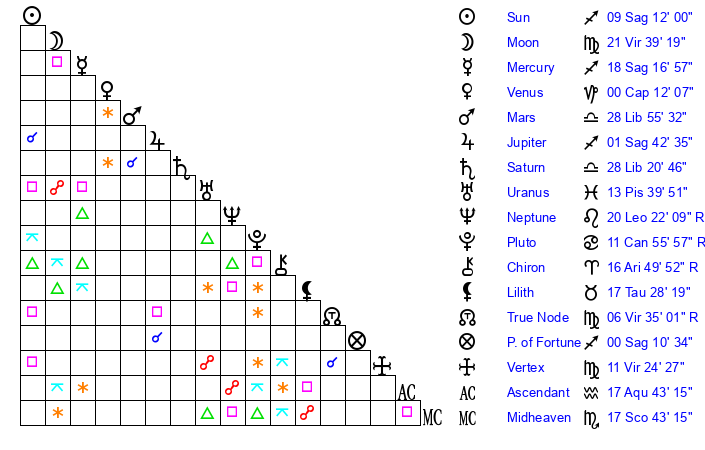 | Saturn | 28 Libra 54 | 25 Pisces 4 | 2 Scorpio 9 |