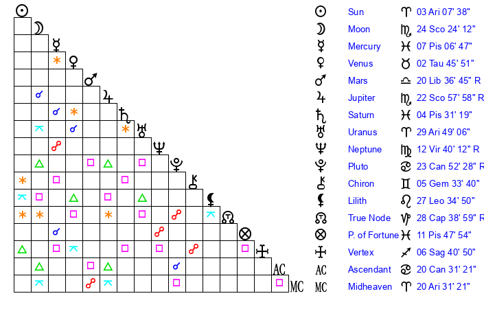 | Sun | 3 Aries 7 | 4 Aries 18 | 0 Cancer 20 |