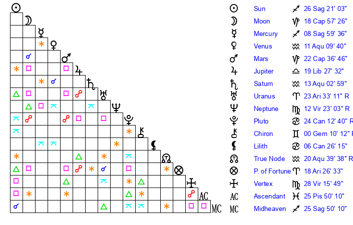 | Moon | 18 Capricorn 45 | 12 Sagittarius 4 | 3 Gemini 13 |