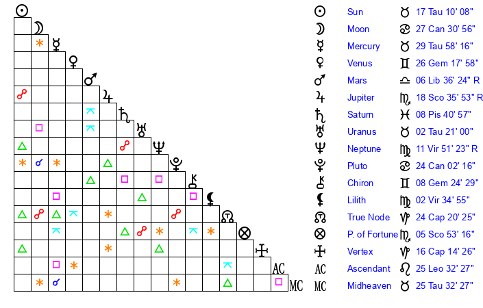 | Sun | 17 Taurus 10 | 18 Taurus 21 | 13 Leo 17 |