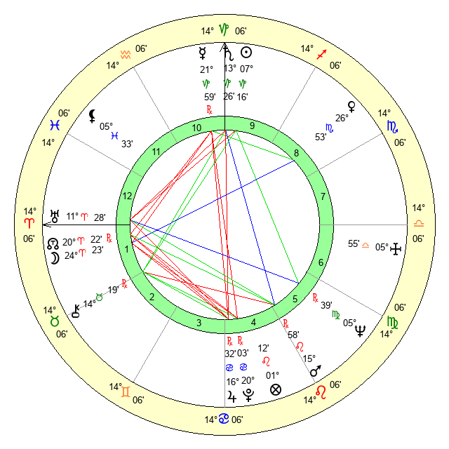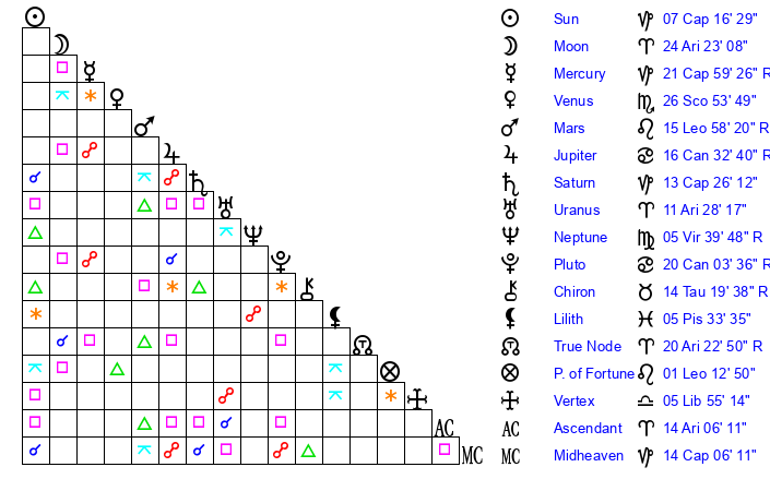 | Moon | 24 Aries 22 | 23 Sagittarius 43 | 10 Libra 15 |