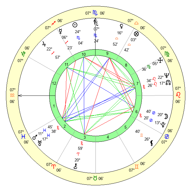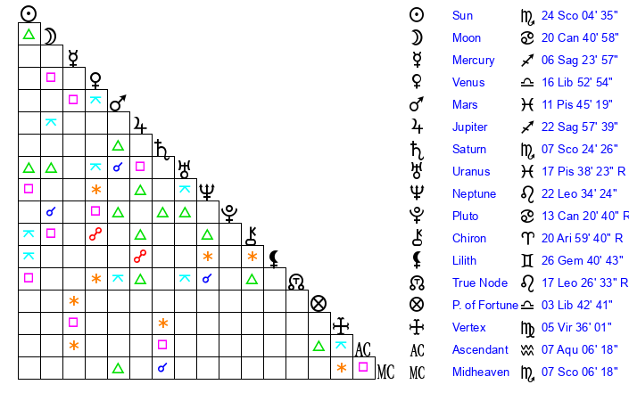 | Saturn | 7 Scorpio 55 | 25 Pisces 10 | 14 Scorpio 51 |