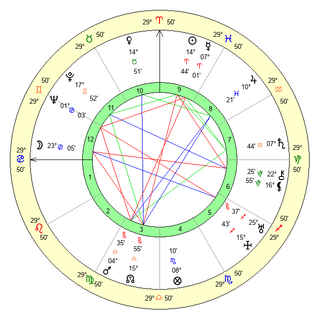 | Sun | 14 Aries 44 | 16 Aries 9 | 12 Leo 4 |