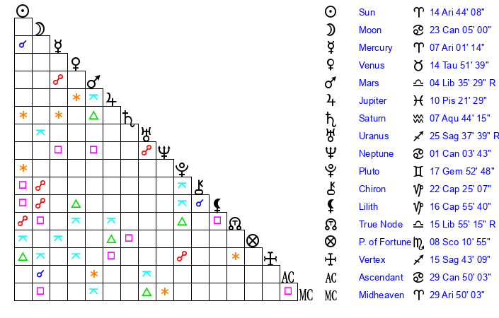 | Sun | 14 Aries 44 | 16 Aries 9 | 12 Leo 4 |