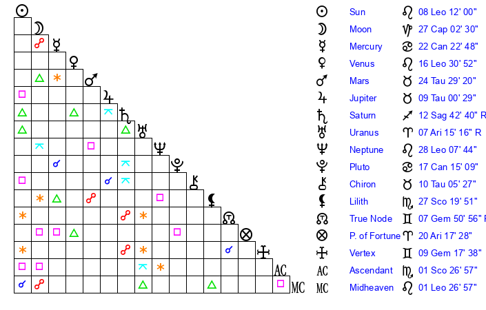 | Moon | 27 Capricorn 8 | 29 Libra 51 | 26 Leo 50 |