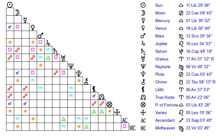 | Sun | 11 Libra 29 | 12 Libra 42 | 16 Capricorn 12 |