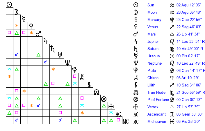 | Sun | 2 Aquarius 12 | 3 Aquarius 44 | 16 Taurus 36 |