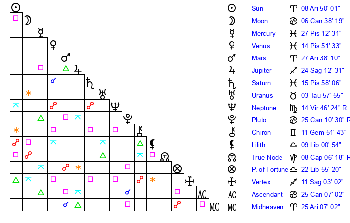 | Sun | 8 Aries 49 | 9 Aries 15 | 4 Cancer 52 |