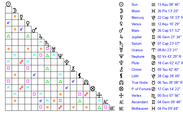 | Venus | 12 Aquarius 11 | 28 Pisces 46 | 10 Gemini 0 |