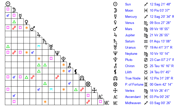| Neptune | 10 Virgo 10 | 27 Pisces 7 | 8 Virgo 37 |