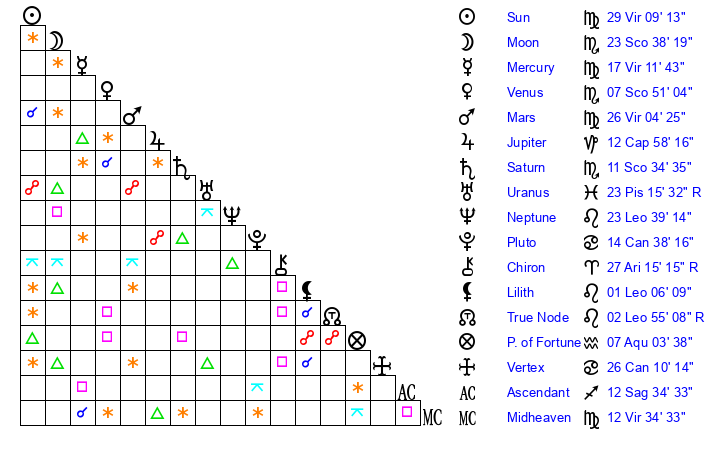 | Mercury | 17 Virgo 12 | 7 Libra 30 | 17 Sagittarius 0 |