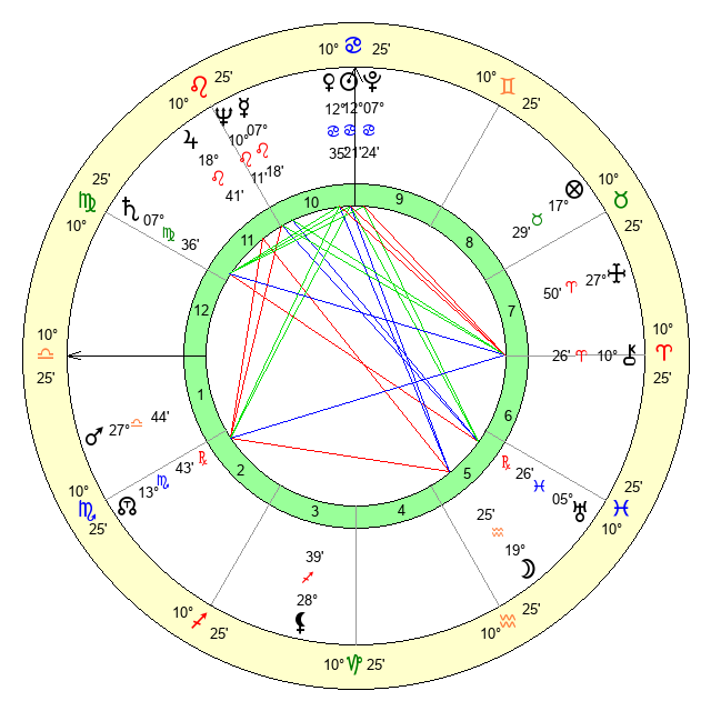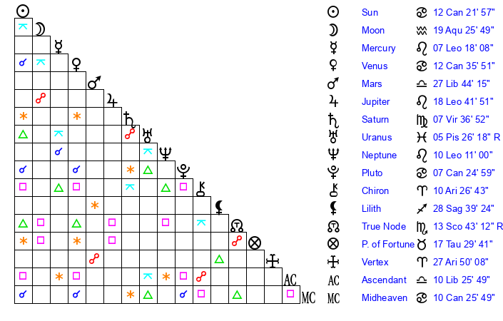 | Venus | 12 Cancer 36 | 0 Gemini 4 | 22 Scorpio 0 |