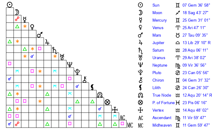 | Sun | 7 Gemini 37 | 8 Gemini 34 | 4 Virgo 41 |