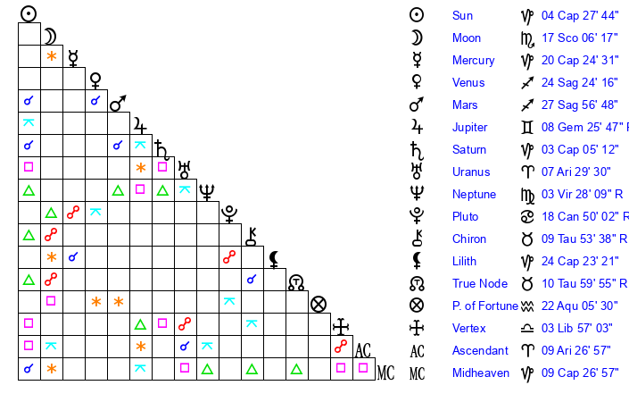 | Moon | 17 Scorpio 1 | 16 Scorpio 19 | 27 Aries 44 |