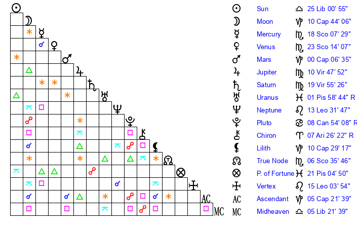 | Sun | 25 Libra 1 | 25 Libra 34 | 11 Aquarius 18 |