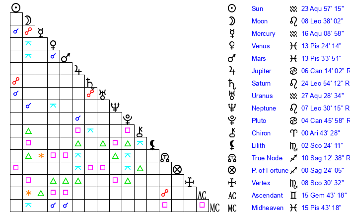 | Sun | 23 Aquarius 57 | 25 Aquarius 15 | 8 Gemini 13 |