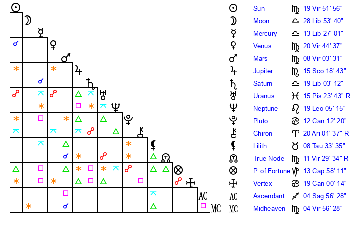 | Saturn | 19 Libra 38 | 28 Pisces 58 | 0 Scorpio 56 |