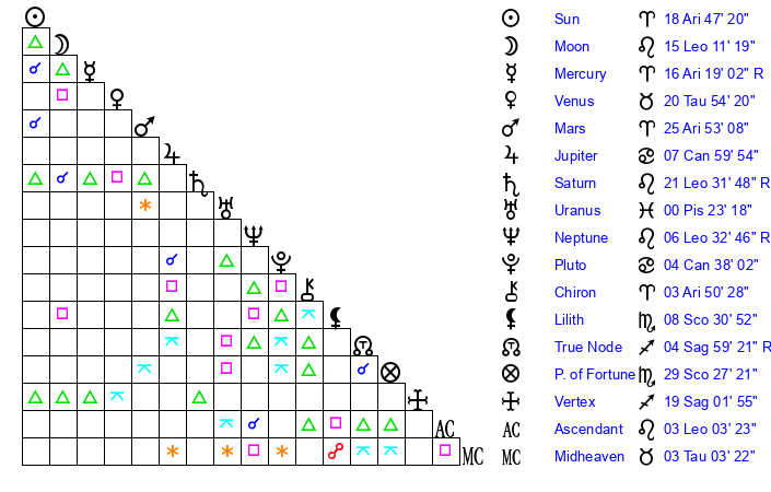 | Sun | 18 Aries 47 | 20 Aries 5 | 0 Leo 43 |