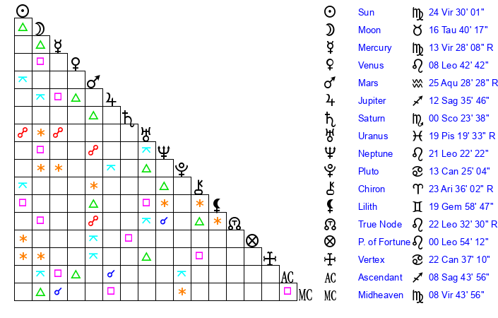 | Saturn | 0 Scorpio 56 | 28 Pisces 40 | 12 Scorpio 13 |