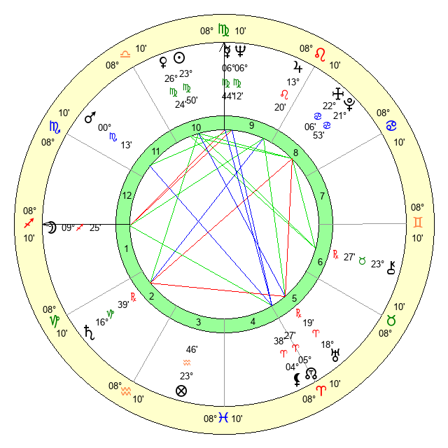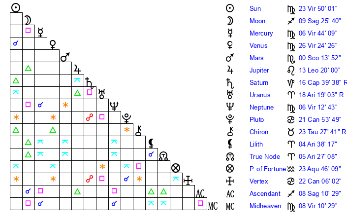 | Neptune | 6 Virgo 13 | 0 Aries 54 | 7 Virgo 58 |