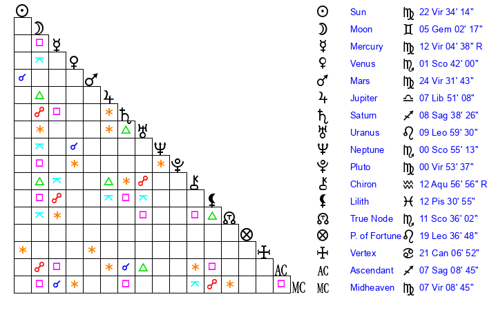 | Pluto | 0 Virgo 53 | 1 Aquarius 32 | 2 Virgo 17 |