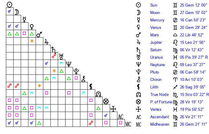 | Sun | 25 Gemini 12 | 25 Gemini 48 | 6 Libra 14 |
