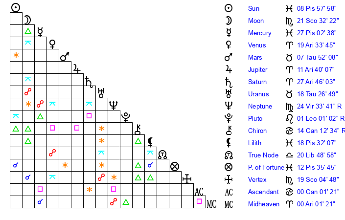 | Moon | 21 Scorpio 27 | 19 Pisces 32 | 0 Capricorn 15 |