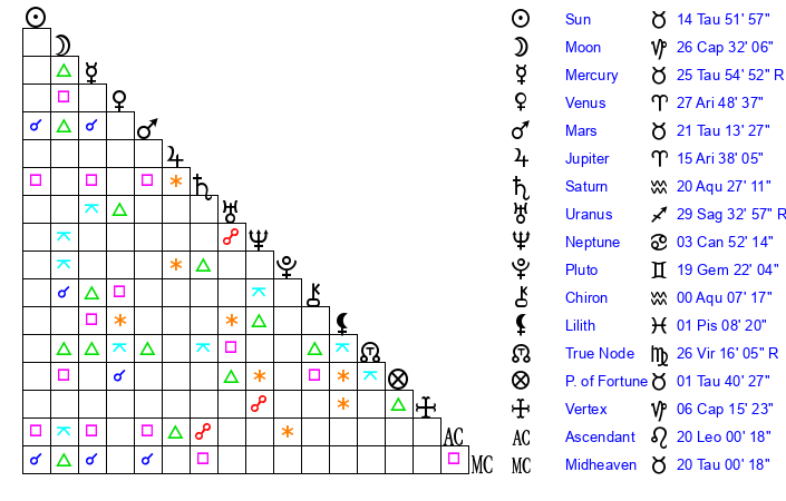 | Pluto | 19 Gemini 23 | 3 Aquarius 48 | 21 Gemini 40 |