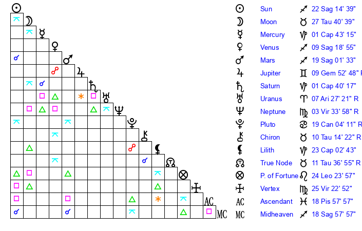 | Moon | 27 Taurus 44 | 14 Gemini 22 | 0 Sagittarius 48 |