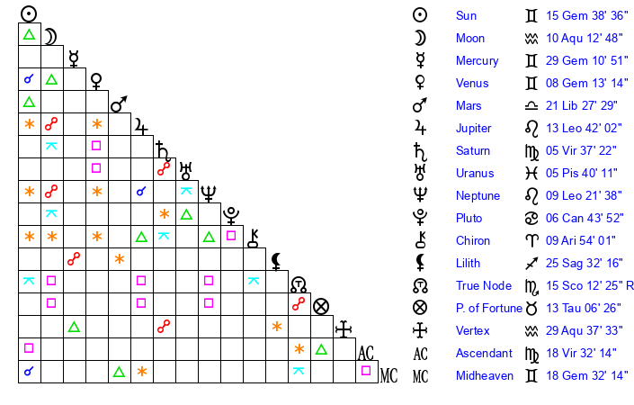 | Sun | 15 Gemini 38 | 16 Gemini 14 | 26 Virgo 26 |