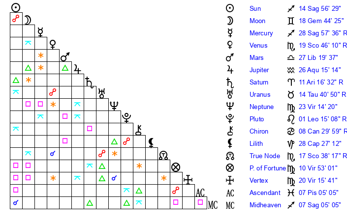 | Sun | 14 Sagittarius 56 | 15 Sagittarius 50 | 13 Pisces 13 |