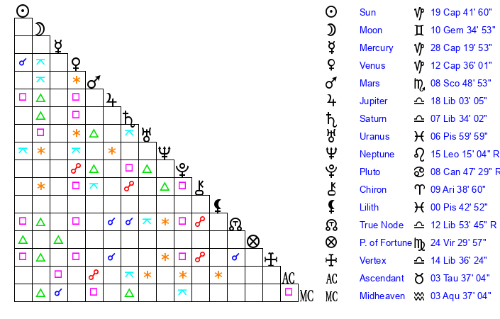 | Moon | 10 Gemini 36 | 9 Gemini 27 | 23 Pisces 42 |