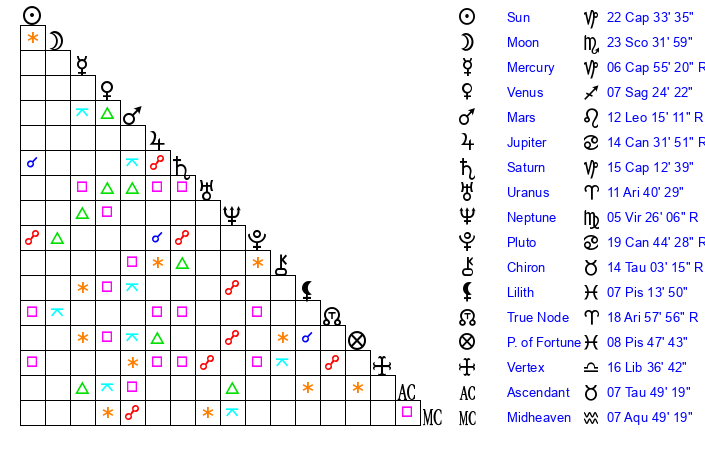 | Venus | 7 Sagittarius 24 | 10 Pisces 53 | 20 Pisces 1 |