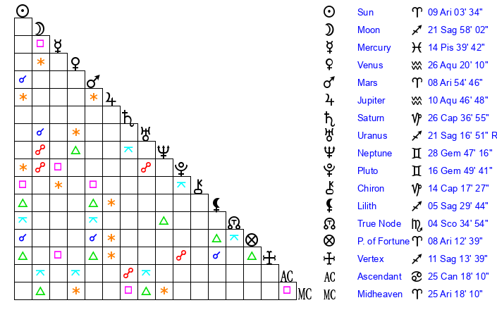 | Moon | 21 Sagittarius 47 | 27 Aries 55 | 24 Gemini 5 |