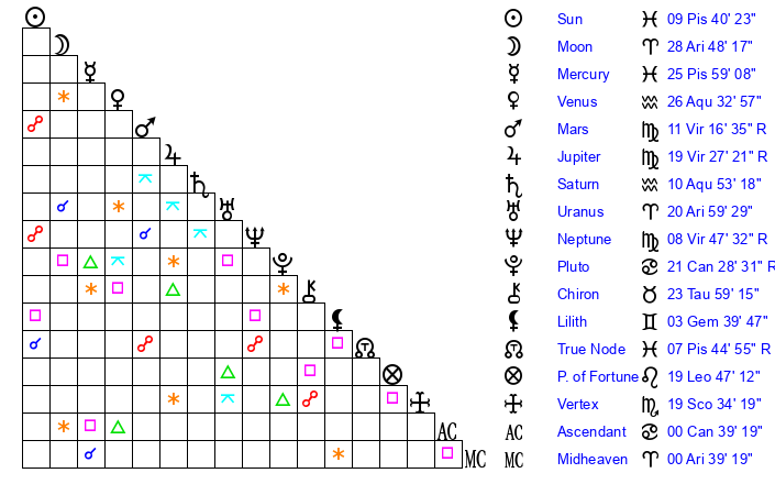 | Sun | 9 Pisces 40 | 10 Pisces 21 | 9 Gemini 46 |
