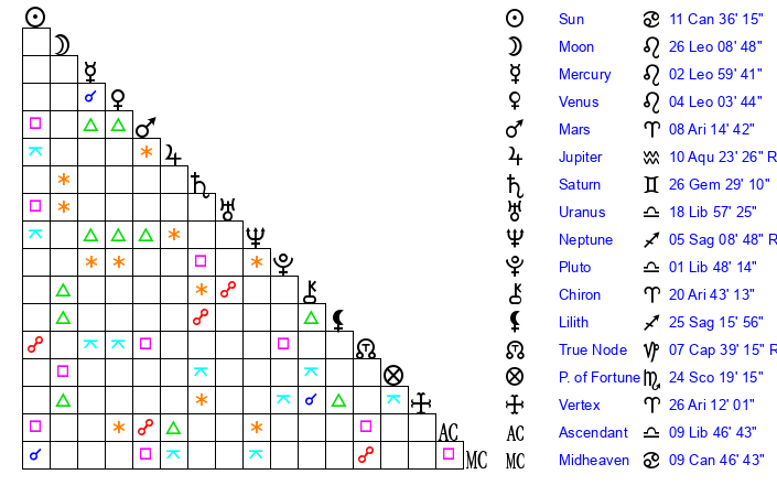 | Moon | 26 Leo 13 | 21 Libra 52 | 14 Cancer 54 |