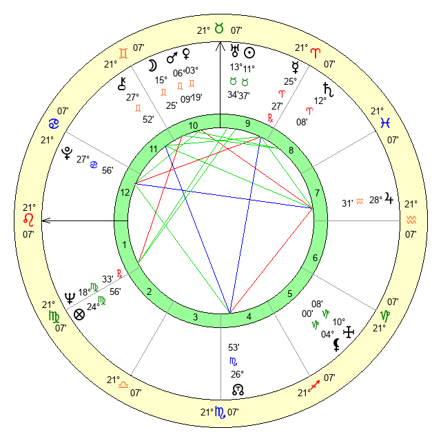 | Moon | 15 Gemini 27 | 19 Cancer 42 | 26 Leo 44 |