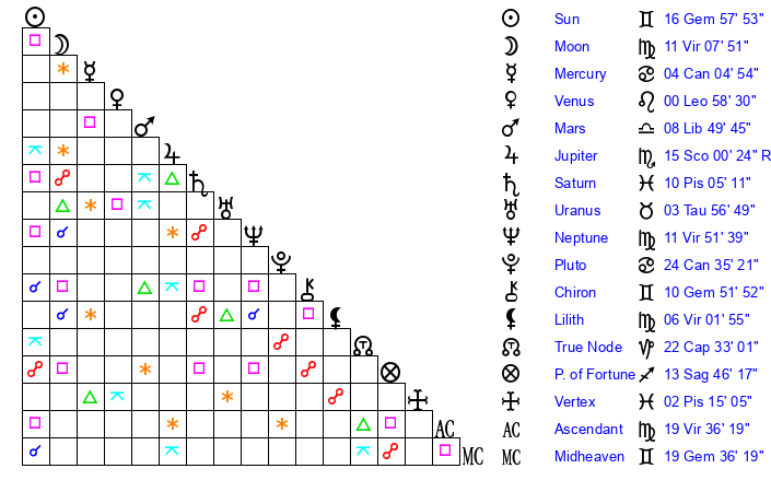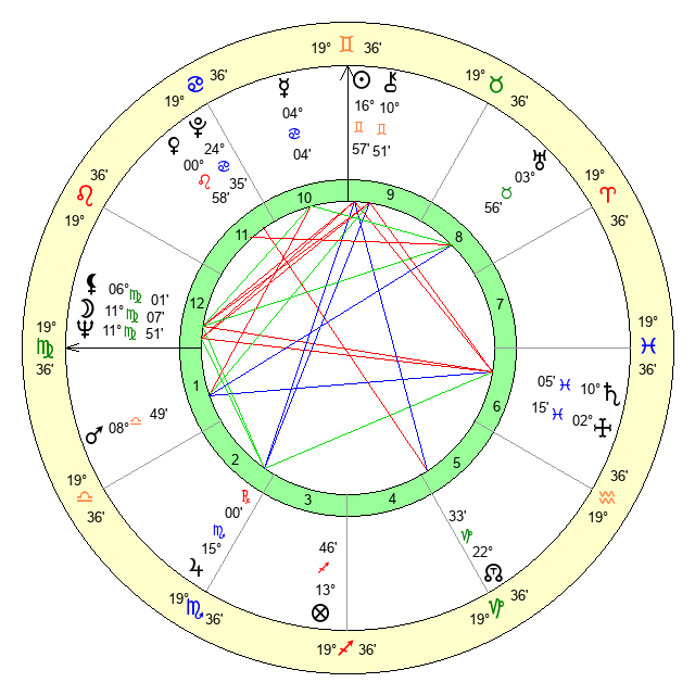| Sun | 16 Gemini 57 | 18 Gemini 9 | 13 Virgo 9 |