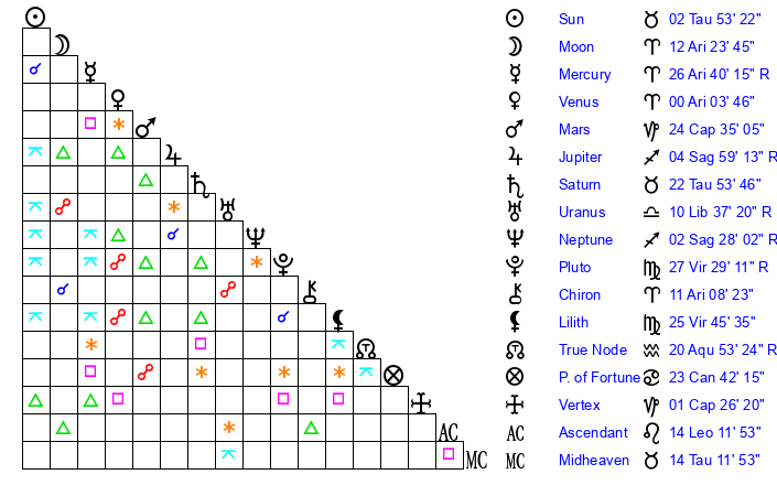 | Moon | 12 Aries 32 | 6 Pisces 54 | 3 Aries 27 |