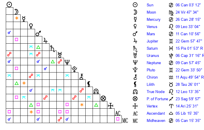 | Pluto | 22 Gemini 34 | 3 Aquarius 10 | 23 Gemini 36 |